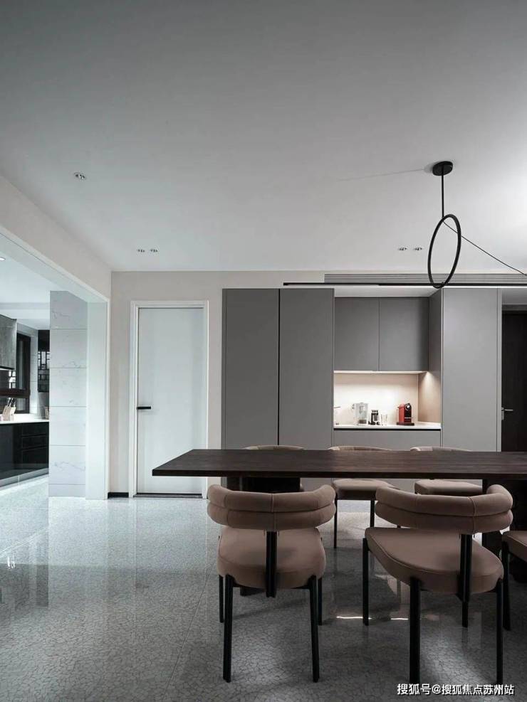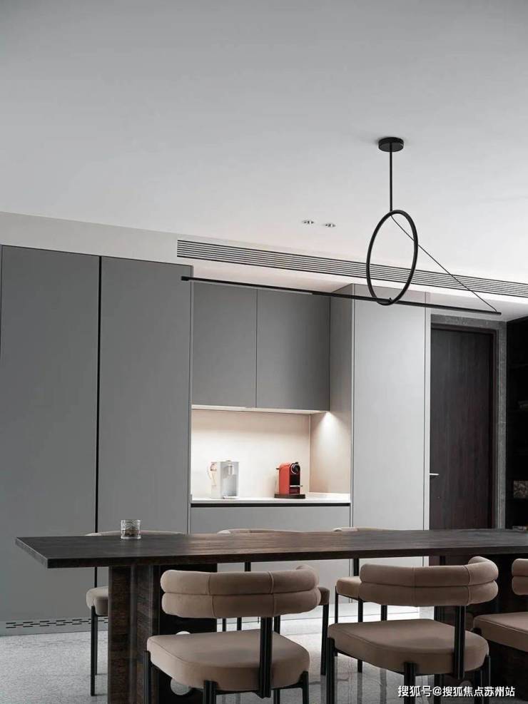 仪式感,是将每一件普通的小事演绎的熠熠生辉。摒弃传统的玄关,使开敞的空间形成吧台的格局,是设计师的巧思所在,创造一种归家的仪式感,告诉你:生活在这里。