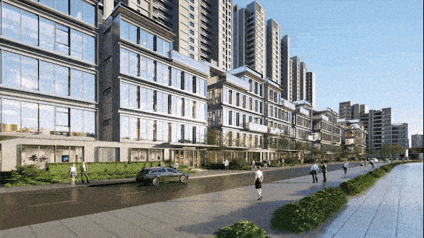 中海海上和集售楼处电话:400-8828-814【营销中心】项目沿飞虹路设置商业街区,与界面现状形成退让,使得住宅和道路之间有一定的空间退让,不仅降低道路对业主的噪音影响,而且给到两侧沿街足够的空间。