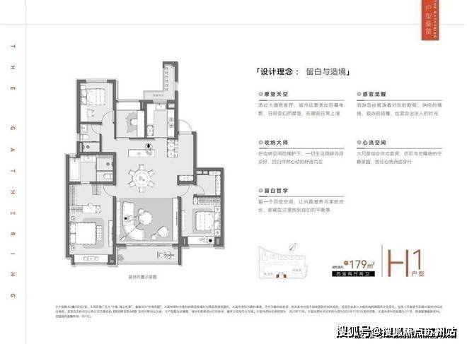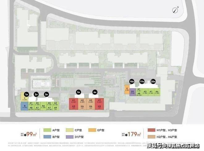 项目主力户型建面约99㎡3房、建面约179㎡4房。