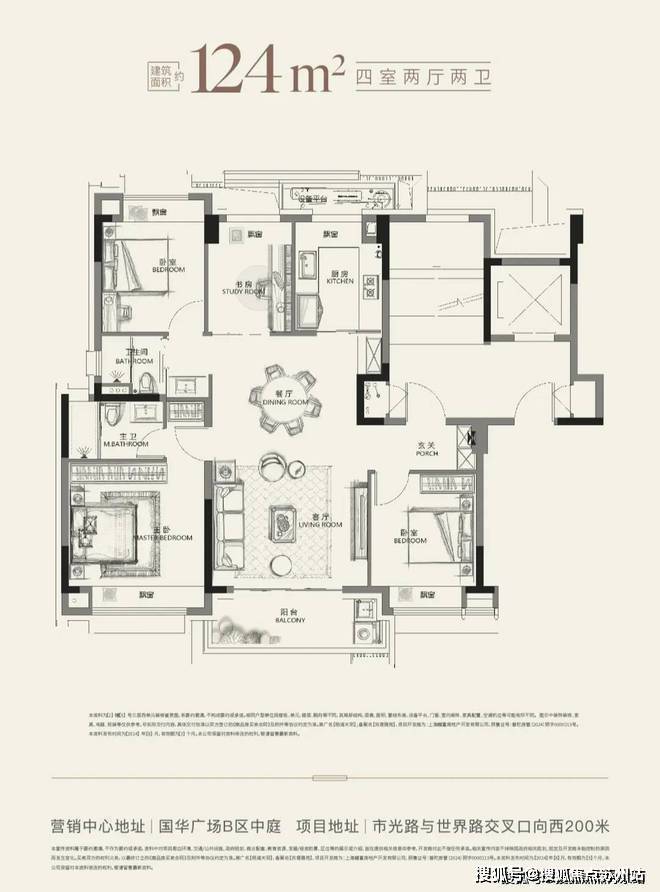 建面约124㎡的一步到位改善四房