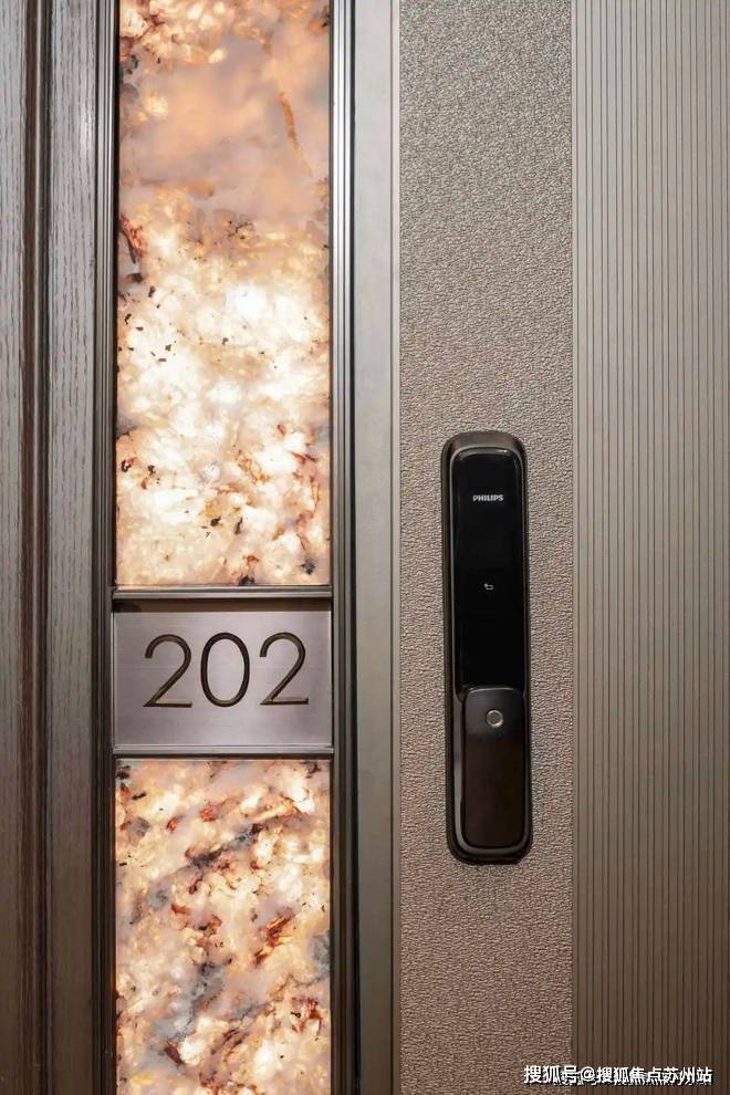 入户门一侧以奢石背景板,内嵌灯带,后期门牌号也会内置灯带,让入户门前更加明亮美观,增强归家的幸福感。