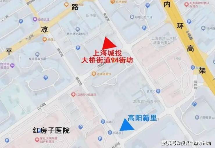 「兴华里」(大桥街道94街坊)地块四至范围, 东至渭南路,南至沈阳路,西至02F1-02、02F1-03地块,北至平凉路。项目距离上海城投上一个板块内住宅项目高阳新里仅一个路口街区之隔,直线距离200米左右。