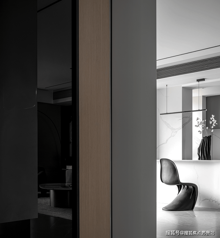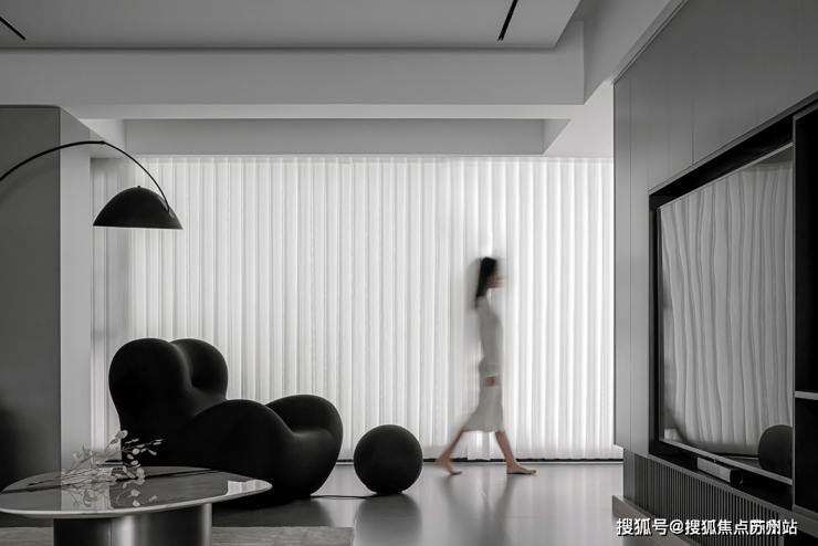 空间布局重新打造,传统设计的隔断被拆除,通透感中,各区域联系更紧密。黑色沙发奇特的造型带来动感和时尚元素,沙发上有凸起设计,提高支撑感,让居者小憩时更加舒适,体会时光温柔。