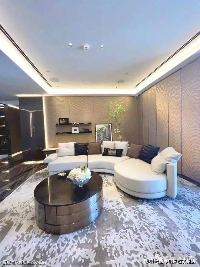 客厅吊顶采用双层设计,为空间带来层次美感。沙发墙面实用灰色软包材料装饰,金属线条进行点缀,优雅不失高级感。