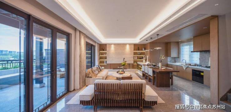 上叠样板间内,开放式厨房,巧妙平衡了日常烟火与家居品质,南向大横厅,纳一方空中花园,放置茶几、休闲沙发,白天晒晒太阳,晚上看看星星,享受难得的宁静。