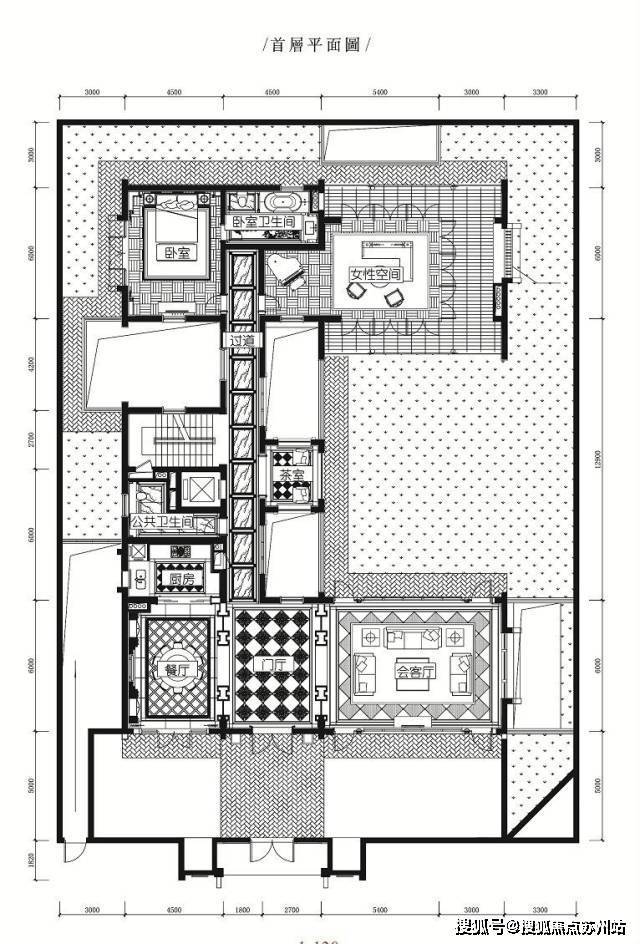 双客厅:双客厅设计,普通别墅的双客厅仅仅是大客厅加家庭起居,而如今别墅生活大多女主人打理。拙政别墅独创女性空间,将大客厅定义为男性空间,展示国宅贵胄。男性空间隔着庭院相望是尺度精致,装饰华丽精巧的女性空间,更有定制香氛,展示国宅雅趣。
