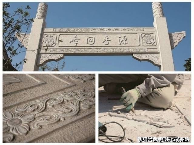 门头木饰板装饰以纯金金箔,两侧墙上镶嵌汉白玉石雕“五福捧寿”,下置坤石与石狮,集传统礼序与姑苏特色与一身。