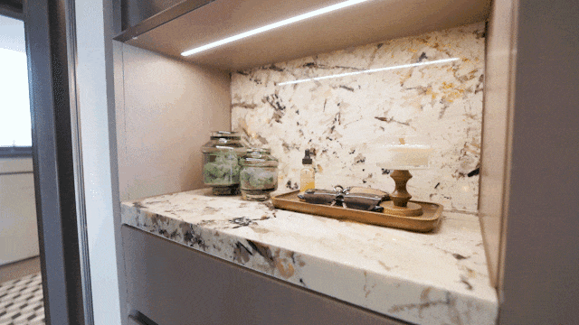 再加华润观宸润府售楼处电话:400-8123-664【已认证】【预约☎】上摩恩单水槽、上吊轨三折玻璃移门、吊柜智能感应灯、臻选橱柜、灶台背墙定制岩板、移动轨道插座等配置,一个厨房可能就给大家“值得”的直观感受。