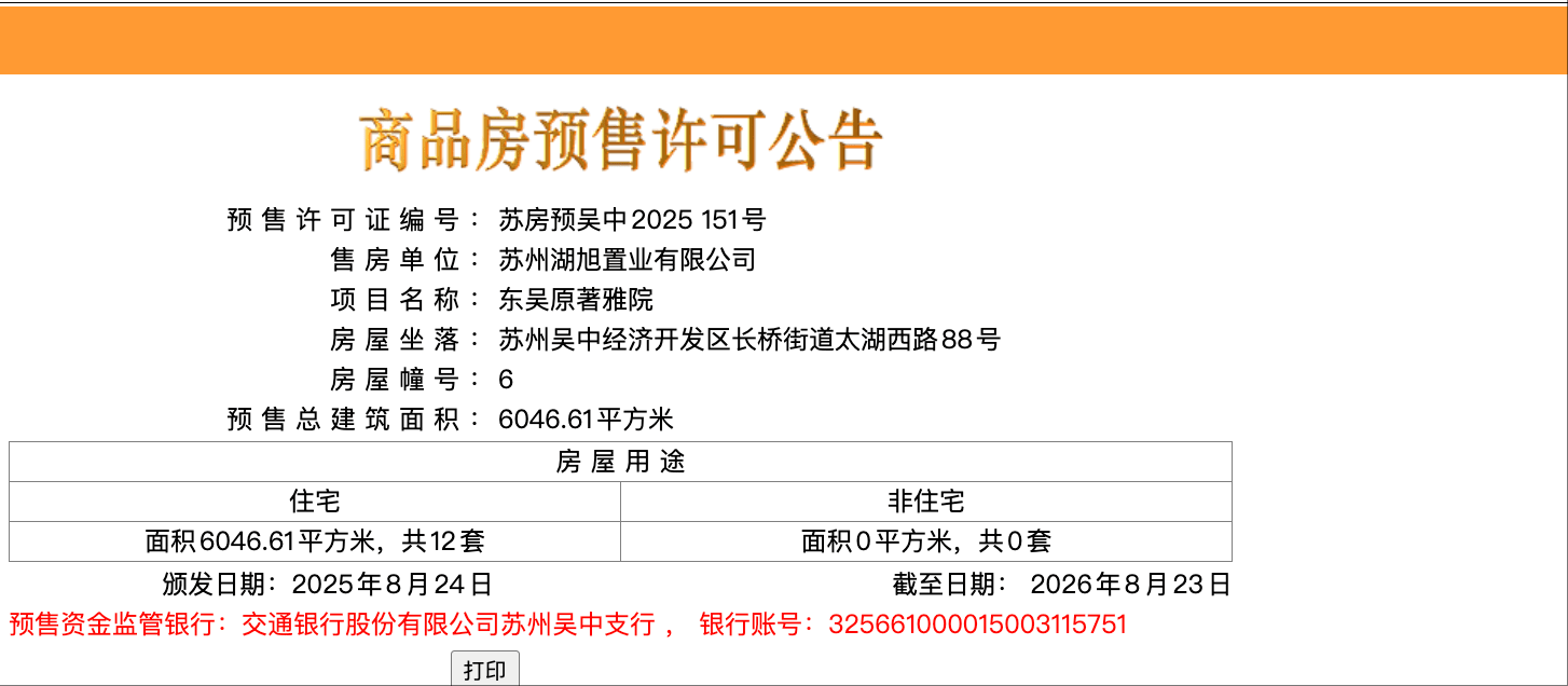 苏房预吴中2025 151号 查看图片 | 2025-08-24 | 6号楼,面积6046.61平方米,共12套 |