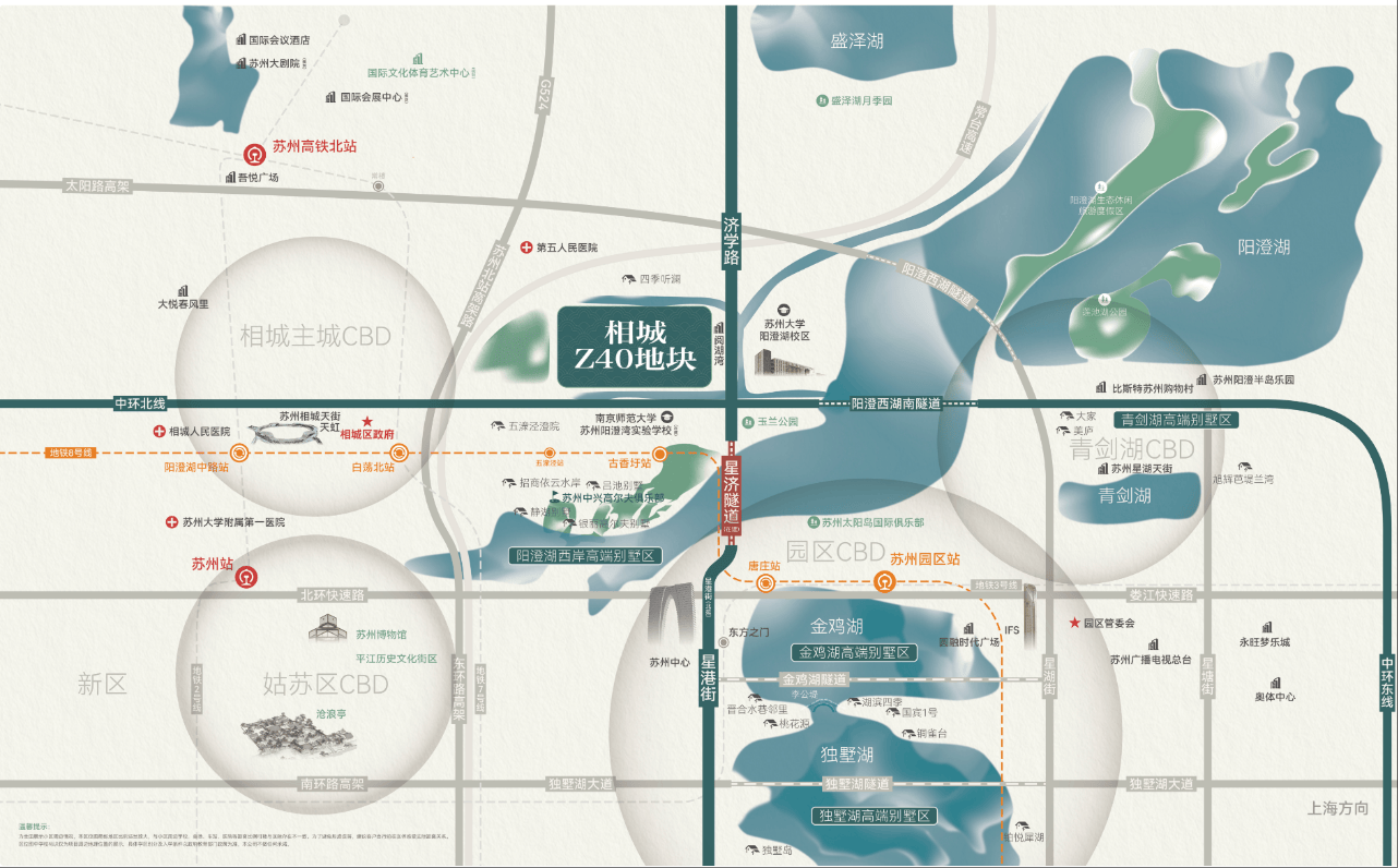 星济隧道(在建)-星港街:约8min抵达苏州中心(预计2027年通车) 丨阳澄西湖南隧道-星湖街:约3min通青剑湖,约20min达湖东 丨8号线古香圩站:步行约800m,4站苏州中心,6站园区时代广场