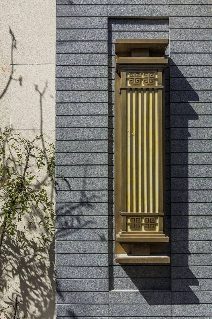 而楼王大门两侧的铜灯形式,由故宫宫灯演化而来,纹饰由传统“席纹”和成熟于盛唐的“卷草纹”组合而成,线条简洁明快,黄铜质地经霜耐雪,堪称致敬盛唐的经典之作.