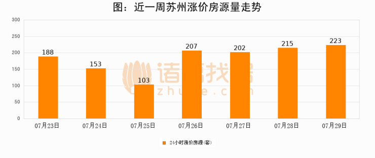 根据诸葛找房数据显示,苏州24小时涨价房源量为223套,较07月28日增加8套,环比上涨3.7%。与此同时,涨价房源占比小幅扩大,业主信心有所提升。