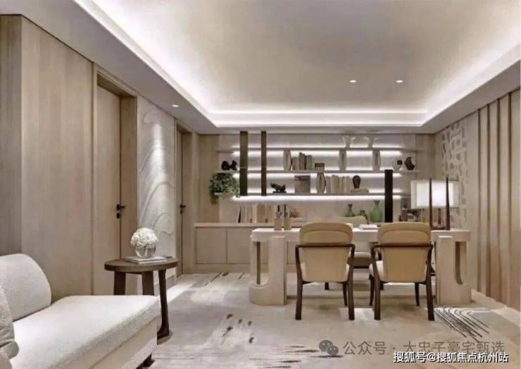顶层下午茶区以淡绿为底,壁炉暖光漫过手绘地毯的肌理,将社交场域沉淀为冥想容器;主人房墙面缟玛瑙(Onyx)的天然流痕,也与一层屏风暗纹形成时空对位,光影在矿物晶体中生长出私密的诗。
