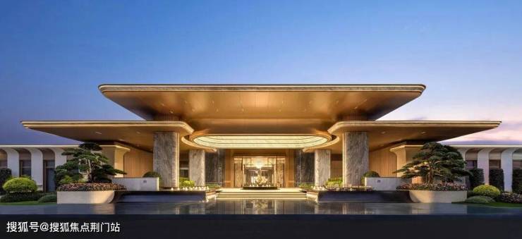 约78.8x9.2米的恢宏大门,铺装大面积的梵高白奢石和古驰黑石材;四根梵高白立柱托起古铜色铝板;层层抬升,宛若步步登临殿堂。