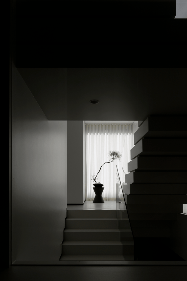 楼梯区完全被几何占据,自然光恰到好处的平衡,进一步呼应着空间的心境,衔接了生活和居所。