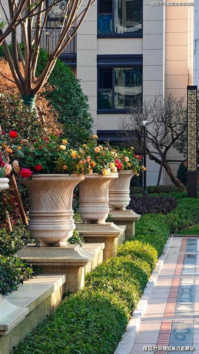 从入口开始,左右中轴对称,每条横向纵向道路都设置了精致景观组团,多采用台湾云波冬青、金玉满堂·鸿运果、造型果石榴、金钱榆、大胡柚、红果冬青、造型金桔、赤楠桩、大红枫、鸡爪楔、羽毛枫、大紫薇(桩)、造型茶梅、造型柿子树、乌桕、红豆杉、红美人、樱花、海棠、桂花等名贵精品树种,打造归家仪式感,移步异景。