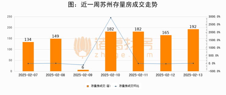 从存量房来看,2025年02月13日苏州存量房单日成交192套,比昨日增加27套,环比上涨16.4%。从近一周存量房成交来看,苏州存量房日均成交套数为144套,02月13日单日成交192套,高于近一周平均水平33.3%。
