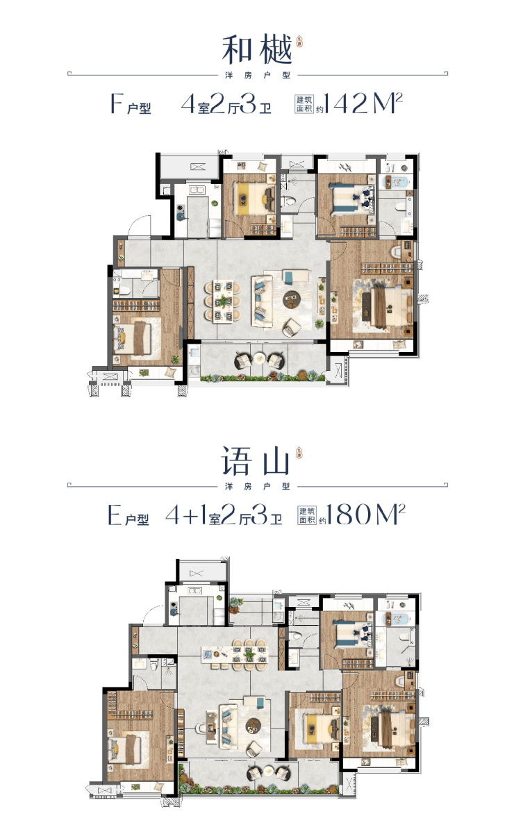 宽境洋房:建筑面积约140-180㎡,空间舒朗,居住体验更上一层楼,尽享低密社区的舒适。