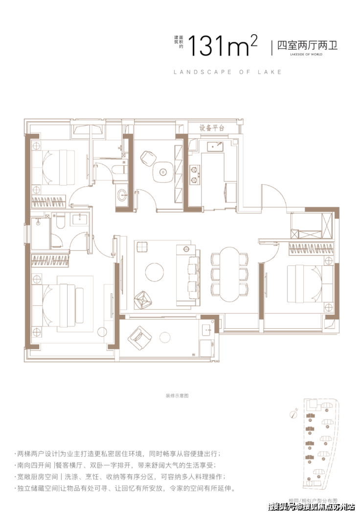 建面约131㎡4房2厅2卫,两梯两户设计,给足了业主归家仪式感和尊崇感,同时拥有一个尺度阔绰的入户门厅作为自己家的延伸!