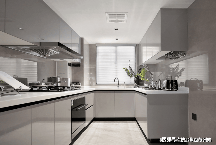 厨房空间,采用铝合金玻璃PVC饰面的免漆门套及铝合金移门,三件套使用老板的油烟机、燃气灶、洗碗机交付,更有摩恩的水槽和龙头、定制的组合橱柜。