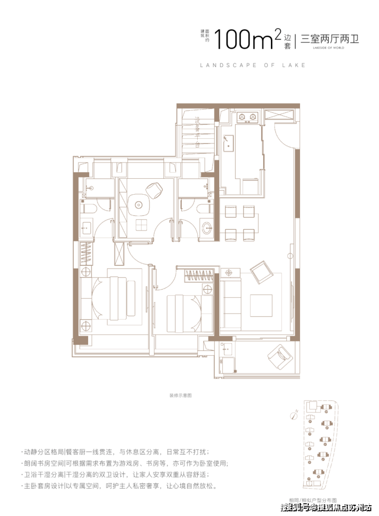 建面约100㎡3房2厅2卫,做到了三开间朝南+主卧套房设计+动静分离+全卧室带飘窗,功能性和尺度感完美结合的3房户型。