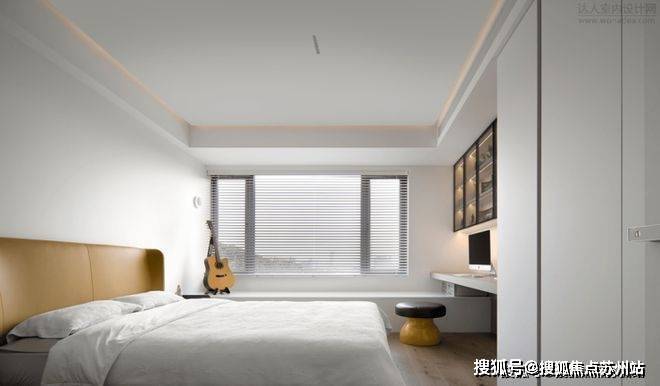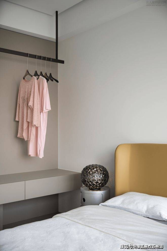 次卧通过丰盈的功能性展现房屋居住者的待客之道,不大的卧室在进行了精致分区后,充分利用墙面和边角区域,做出了梳妆台、更衣区、休息区以及收纳柜,床体周围的空间进行了“完美三分离”,满足客人的任何需求。