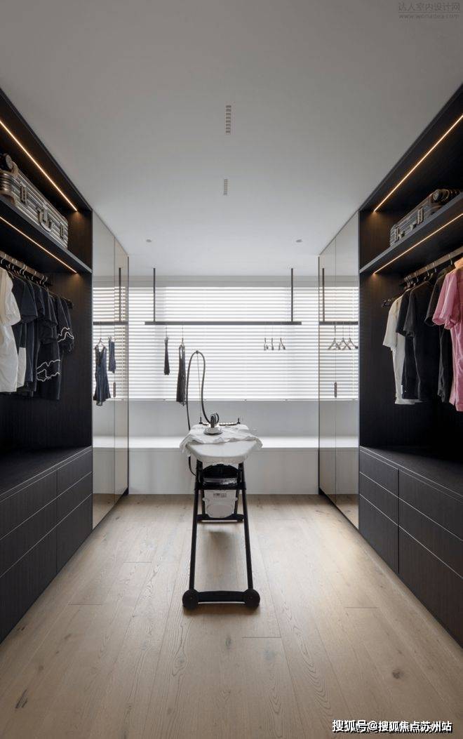 卧室另一侧分别设计为更衣室和浴室,深棕色的隔断墙点明了恰适的隐私尺度,也在视觉上遮挡住两个区域之间的间隔。