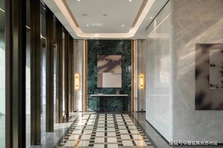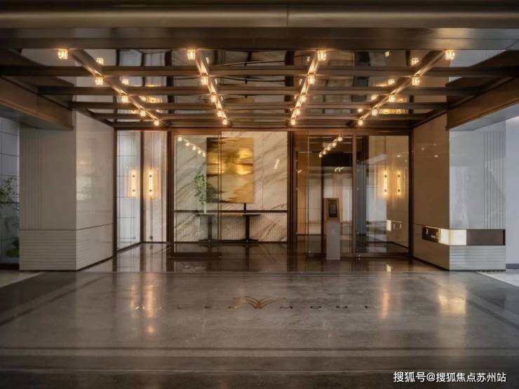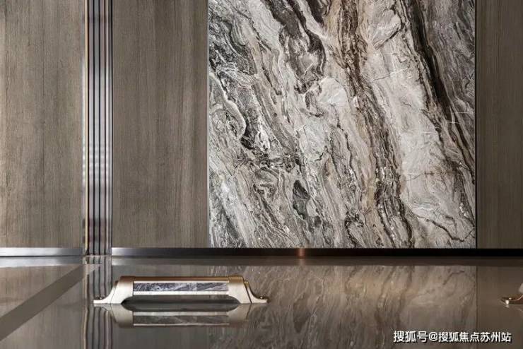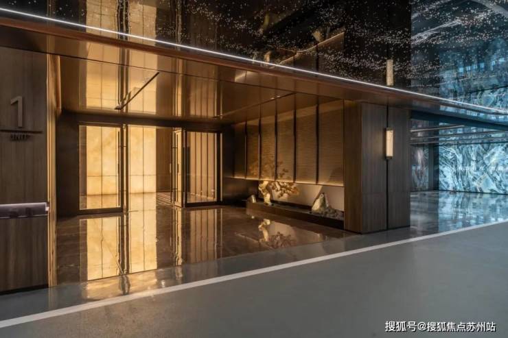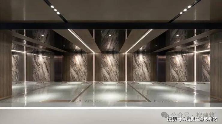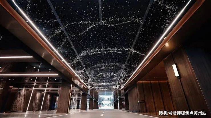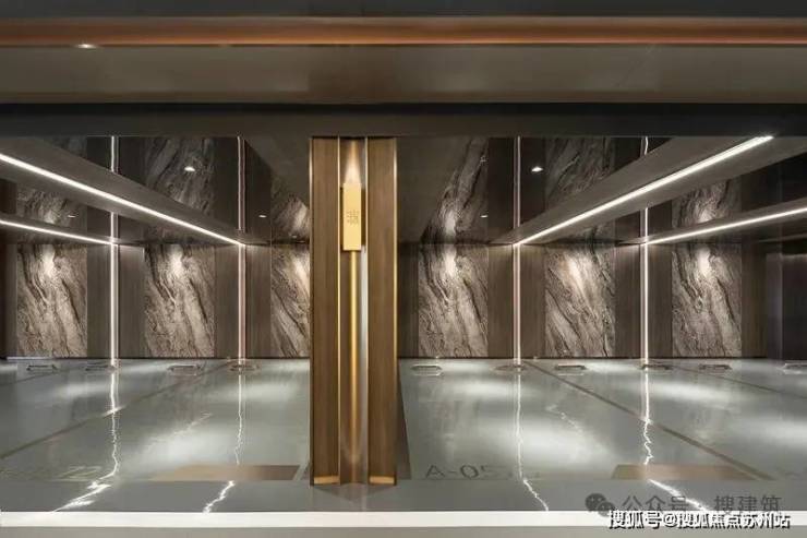 全铝板吊顶、3万颗灯源的星云光纤艺术吊顶、在车库吊顶位置还装饰了黑色镜面不锈钢;木纹饰面结合弧面不锈钢壁灯的柱网,且配置“消隐”消防栓;大面积仿玉石岩板车库背景墙;光面环氧地坪、车道是橘皮环氧地坪、香槟色车挡和地面划线……;与车库无缝衔接的艺术地下过厅;通高、低调奢华的地下大堂和候梯厅……
