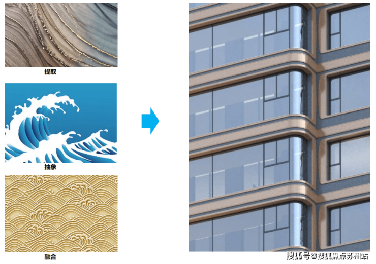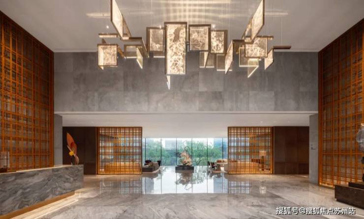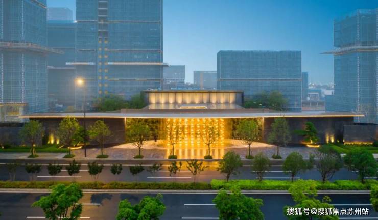 入口选用酒店式入口的造型设计,其灵感源自迪拜世博会场馆,840块纯手工拼贴的3D 曲面铝板大门,每块鳞片都不一样,远远望去,波光流转