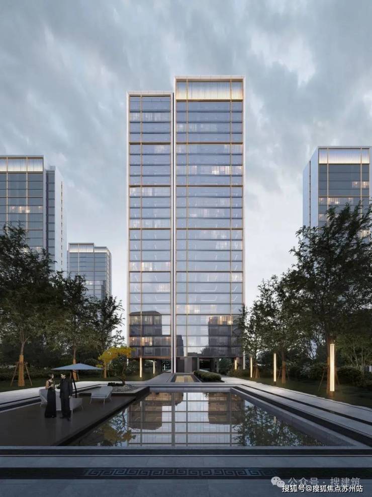 全封闭的阳台设计、香槟色的金属线条镶嵌、双层钻石斜切金属框的设计手法,让立面更为挺拔、精工奢美。顶部的造型,通过玻璃内衬格栅的方式,结合高低错落的标志形体,如瓯江上的灯塔。