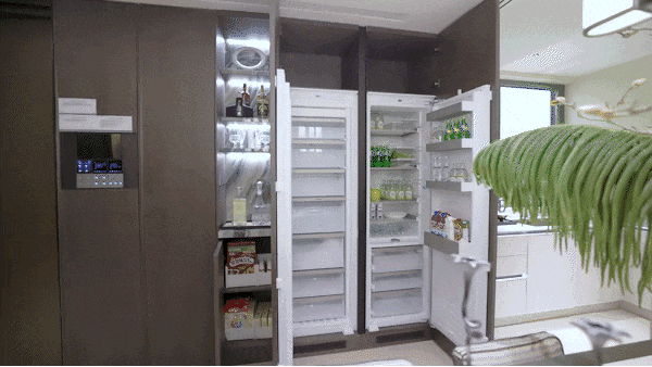 惊艳的当属那台嘉格纳冰箱,嵌入式与墙体严丝合缝,德国精工美学与东方收纳智慧在此碰撞。