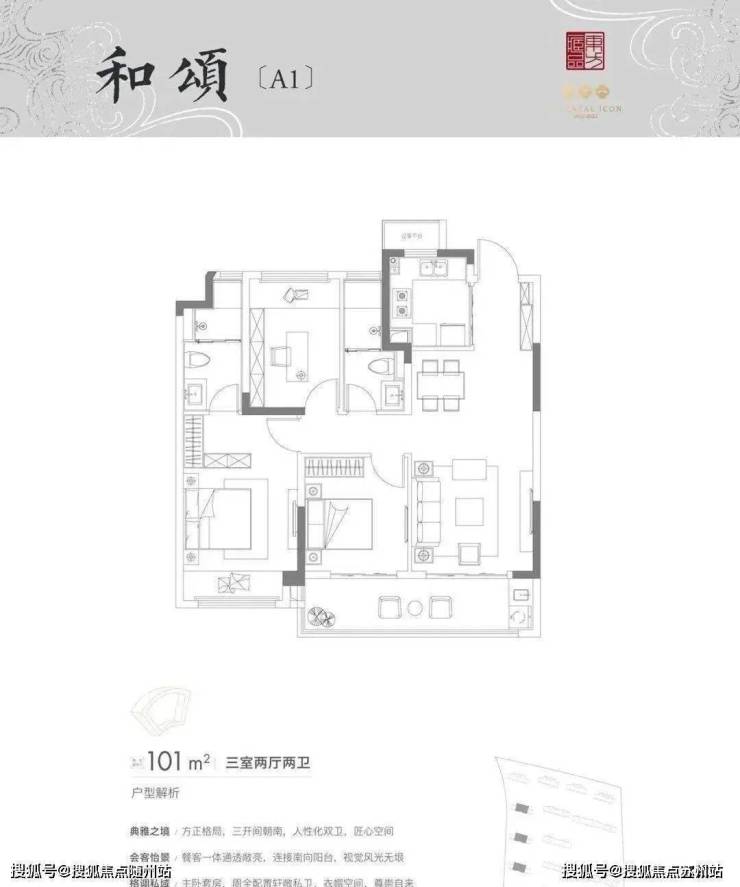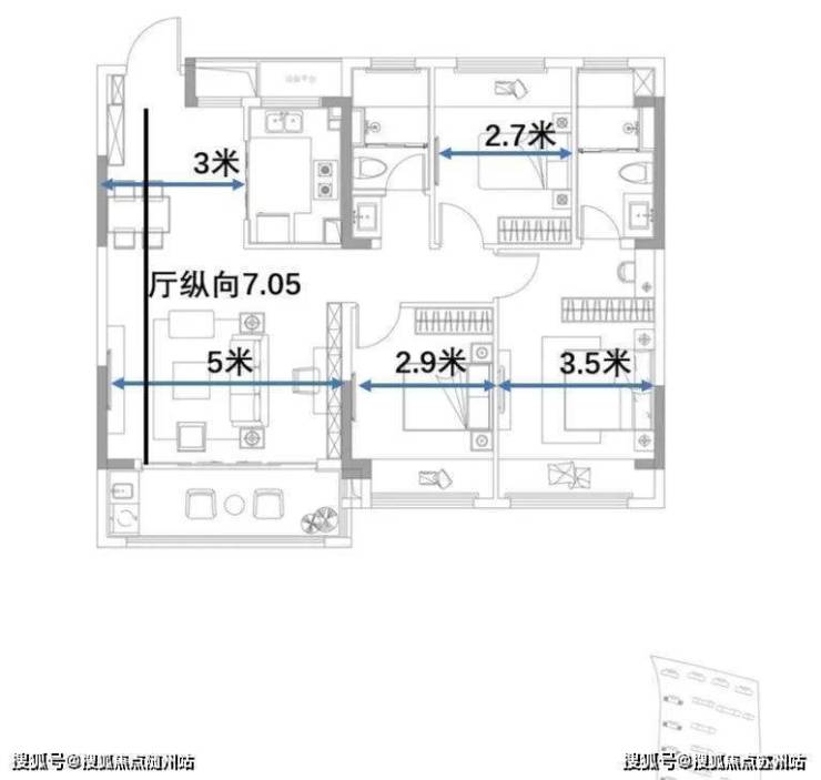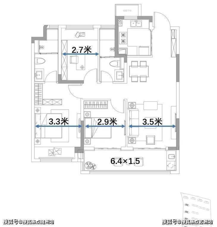 经典的小三房,胜在两卫设计,功能性很齐全,但面积注定了空间尺寸,餐厅会蛮拥挤的