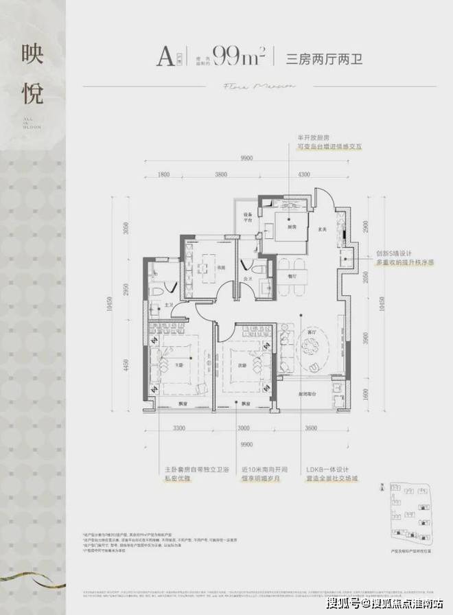 该边套户型,不仅有270度的采光视野,主/次/客卧三大开间并立朝南,“含阳光量”十足。