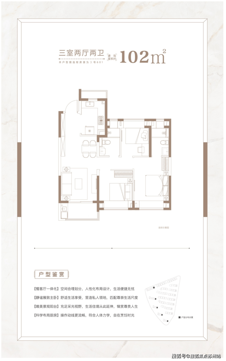 案场限流 看房需提前来电预约登记三开间朝南+主卧套房设计+动静分离+全卧室带飘窗,采光优秀;厨房预留大尺度冰箱位;双卫设计,没有了“早高峰”的烦恼;主卧套房,尊享私密和奢阔尺度。舒适度和尺度感兼具,非常匹配精英家庭的生活追求!