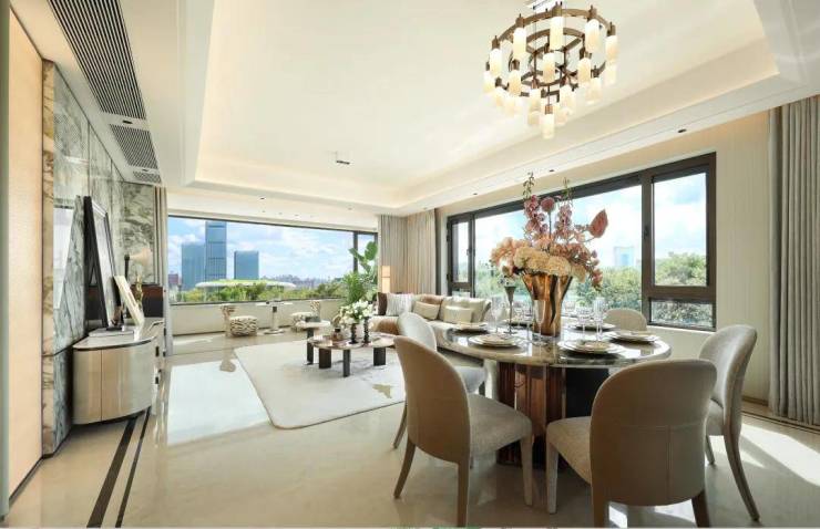 该户型客餐尺度达7.5米观景面,270°极致环幕窗景,最大化引景入室,百万方森态谧境成为私享级流动窗景。
