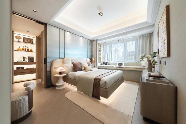 居住体验方面,该户型打造行政级主卧套房,带步入式衣帽间、私享卫浴及南向超阔飘窗。