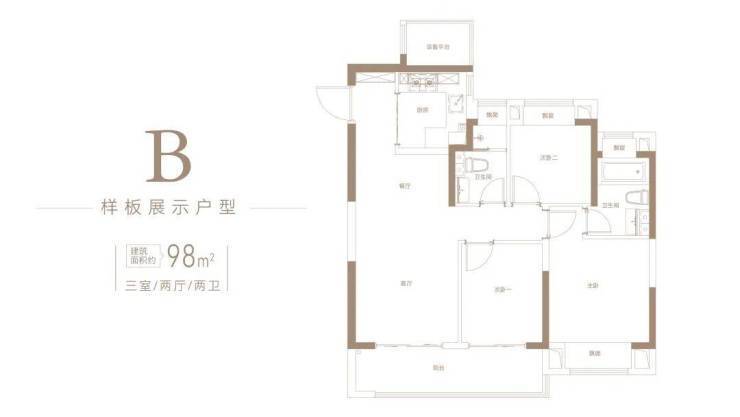 建面约98㎡:三室两厅两卫,主卫带浴缸