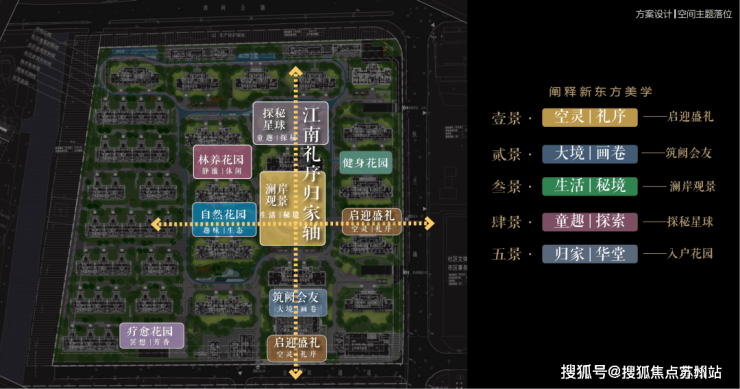 以江南人文精神为源点,打造两轴一环五进空间,江南礼序归家轴串联启迎盛礼、筑阙会友、归家华堂等5重礼制,尊崇归家;