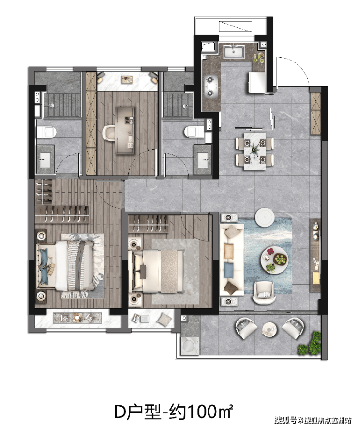 建面约100㎡3房2卫,阳光三房,同等面积更多功能;宽幅南向观景阳台,把居住变成风景;步入式衣帽间,给予生活更多从容。