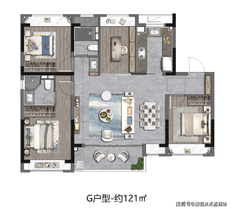建面约121㎡4房2厅2卫,宽境4房,拓宽空间尺度;大开间、进深短,通透采光;主卧独立卫浴,优雅随心的寝居感受。