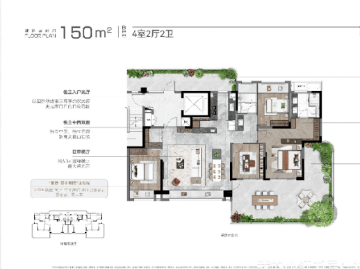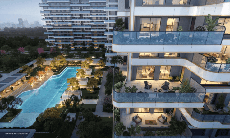 每户标配 30–50㎡空中庭院 ,采用奇偶层错位+L型咬合设计,形成270°无遮挡环幕视野