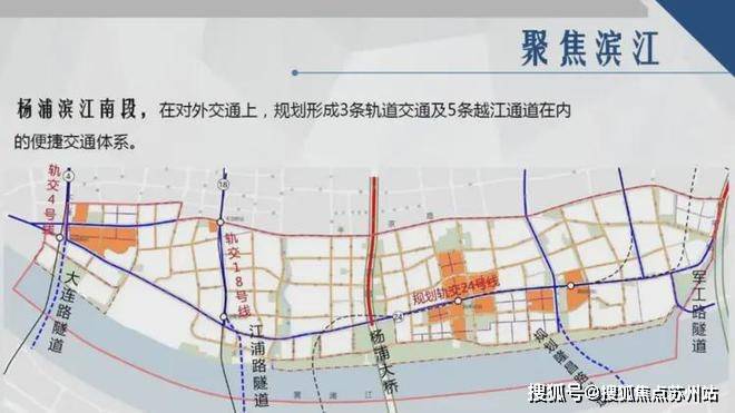 交通方面,滨江南段虽然有五大隧道:隆昌路隧道(规划)、军工路隧道、周家嘴路隧道、大连路隧道以及江浦隧道,将浦西与浦东最核心区域紧密连在一起。但一直缺一条东西向的轨道交通,将其串联。如今这短板也因24号线的规划,有望被补齐。