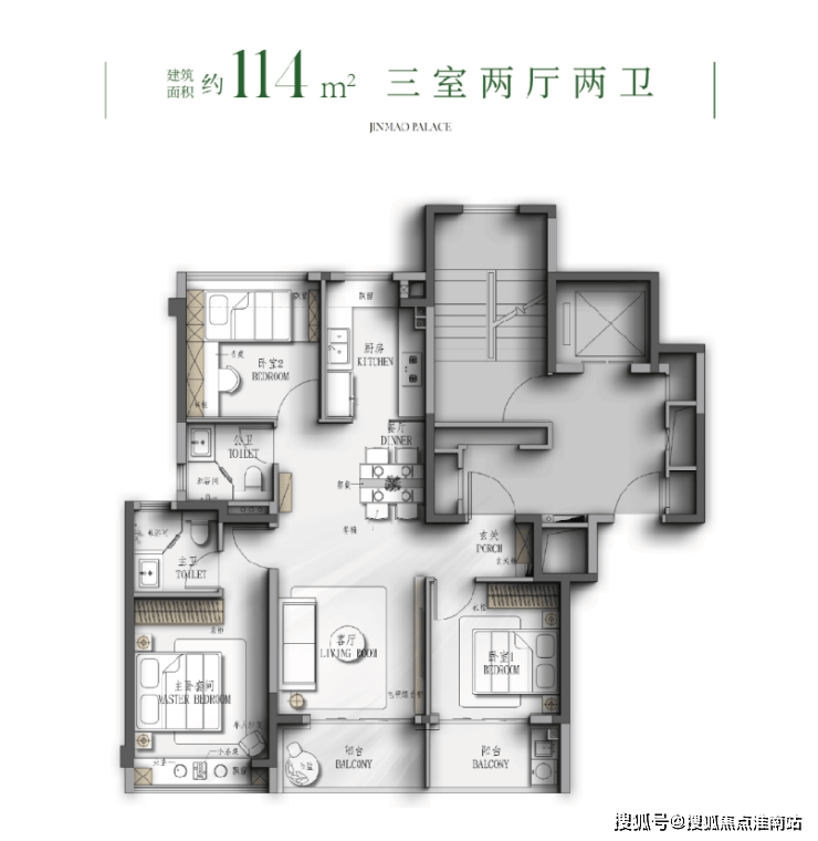 建面约114㎡3房户型图▼