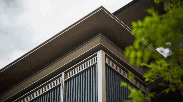筑显匠心:汲取宋代建筑精髓,融入中式重檐、凤尾悬鱼等元素,结合现代干挂铝板(部分真石漆)、云纹铝板、质感石材与LOW-E玻璃,超大窗墙比引光纳景,建筑通透而轻盈。