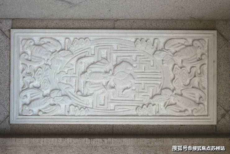 门头木饰板装饰以纯金金箔,两侧墙上镶嵌汉白玉石雕“五福捧寿”,下置坤石与石狮,集传统礼序与姑苏特色与一身。