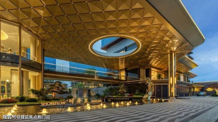 与这两年流行的“阔绰”门头相比,这座鎏金门头最大的亮点是通透——不仅顶部有一个圆形的镂空,偏置的大堂也为风景让了路,正前方没有任何遮挡,反而把最精彩的立体花园化作一幅动态图景,点缀了整条街道.