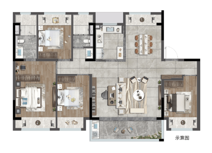 约173㎡(4+1房):这算是楼王户型了,一梯一户,专属感拉满。双套房设计,主卧和次卧都带独立卫生间。约6.5米的大阳台,视野无敌。