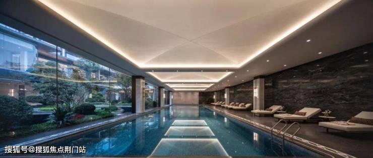 下沉式庭院的立体景观就像画一样,被悬挂在恒温泳池的落地窗外,也在健身房一整排的跑步机前;私宴厅甚至做了270度的落地玻璃,直接插到了庭院景观里。