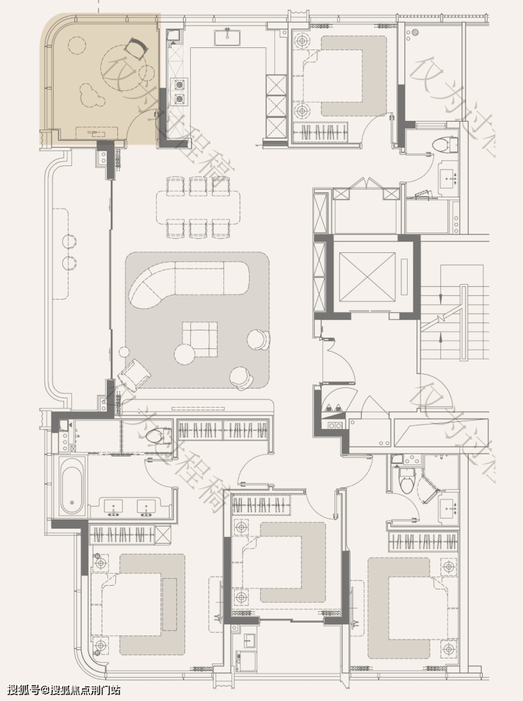 天澜传序府建筑面积约265方的户型,更是直接就做出了大平层,才有的尺度感——