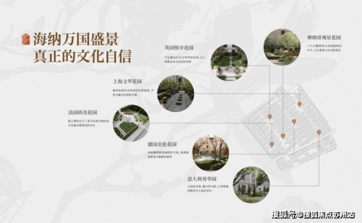 景观呈现上,三棵被园林大师从泰山万里挑一的松树屹立弄巷,诠释着静安里对于社区景观的见解。在未来的社区中,有具备异域风情的摩纳哥观星花园、古典美感的英国悦享花园、浓缩宫殿气质的法国尚美花园、海派意蕴的上海文华花园、以及严谨的德国美伦花园、浪漫的意大利花园。六大万国花园,无不向未来业主展现着“海纳百川”的深度文化自信。
